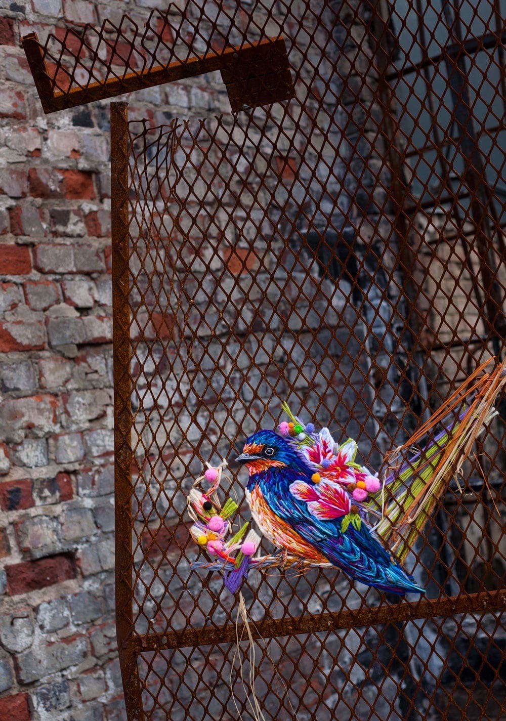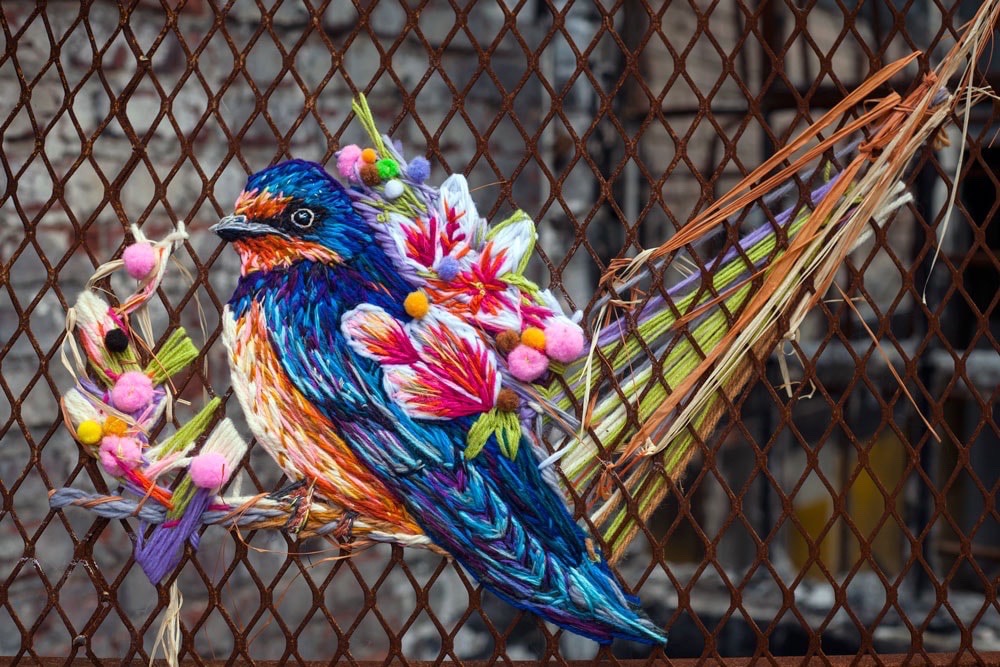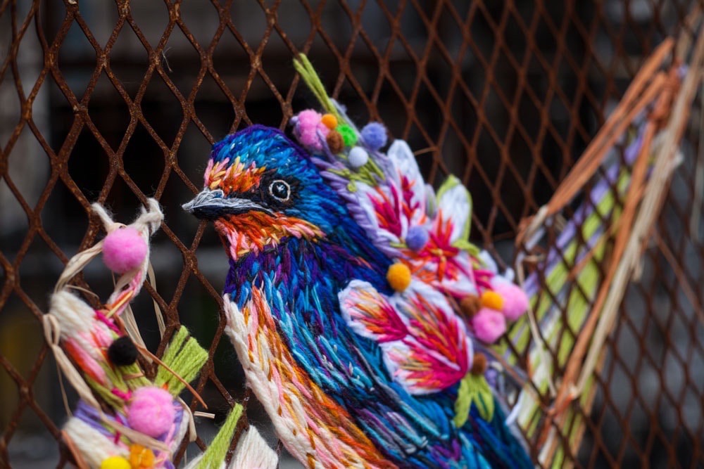Cloughs applies her embroidery work on a wide variety of everyday objects such as shoes and clothes, or in the environment, for example, on fences. The piece, Bird, was created for the United Nations as a part of the lead up to the first World Humanitarian summit in 2016. As boundaries and borders are very relevant today and shape the understanding of the world, depending on side of the fence, Clough is giving a new approach to it. By handcrafting directly on the fence, Clough make us look differently on an object that is suppose to divide places. The fence looses its cold appearance and it connects both sides.