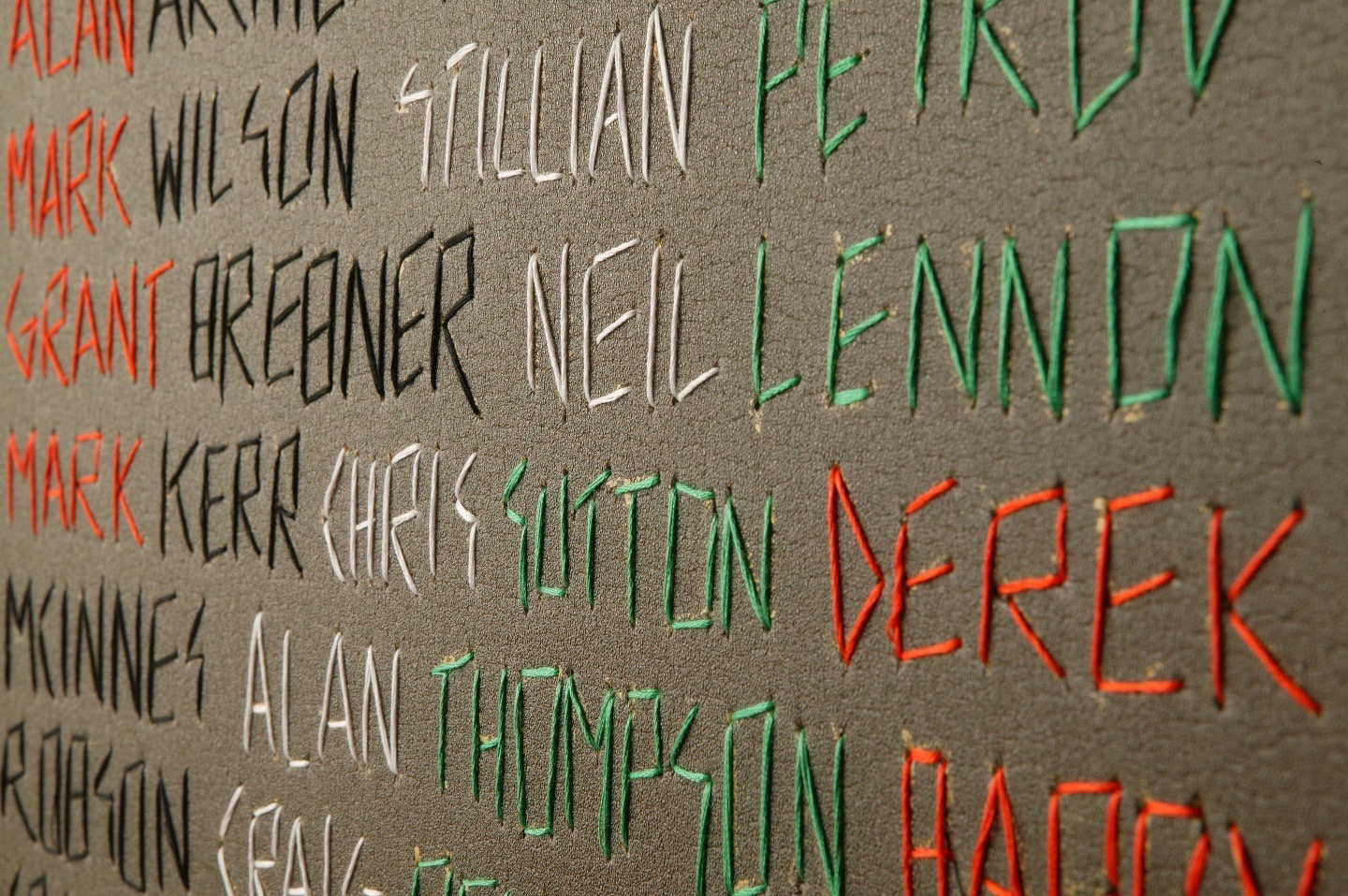Jochen Flinzer handles needle and thread in an unconventional way by creating images that can always be viewed from two sides. A pre-defined A-side is equivalent to an abstract B-side. In The Big Cup Final, Flinzer refers to the Scottish Cup Final in which the Celtic Glasgow and Dundee United teams contested. Celtic Glasgow won and became the cup winner. The names of the players in this match are embroidered in the clubs’ colours on a camping mat: green/white for Celtic Glasgow and orange/black for Dundee United. They are listed club-alternating in the order of formation. On the back, the threads are alternately guided horizontally and vertically: Green vertically, white horizontally, orange vertically, and black horizontally. This work is a game of codes. Just as the colours stand symbolically for the clubs and can be immediately assigned by every fan, the back is based on the structure of the tartans, or tartan patterns, which mark the different Scottish clans.
