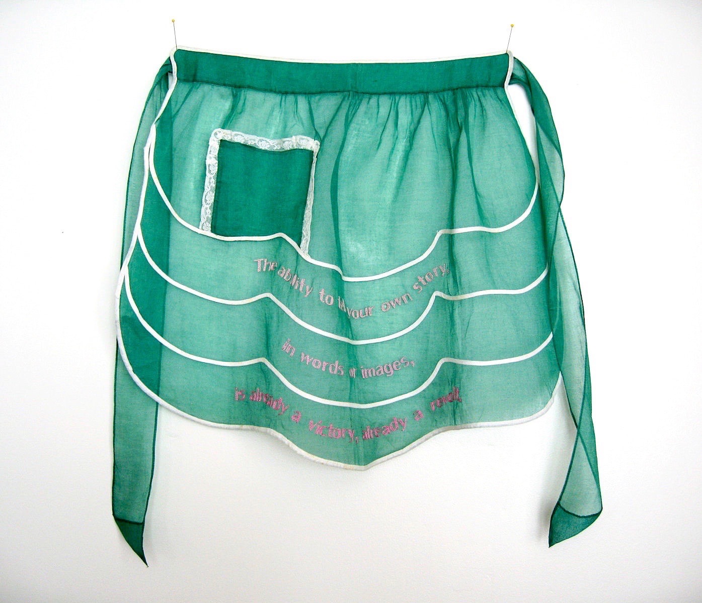 Barb Hunt lives in Newfoundland, Canada. The rich tradition of domestic textile practices inspired hepIXU pIXU pIXU ,IXU ؓIXU IXU @ IXU docile appearance of the apron and the power of telling one's truth. Embroidery can infer feminine obedience but the needle can also be wielded to prick the establishment. As a feminist artist, Hunt uses textile processes in solidarity with women of the past and present who devoted their labor to make the world a better place. Thus, Hunt politically loads the aprons and creates a different meaning of the object.