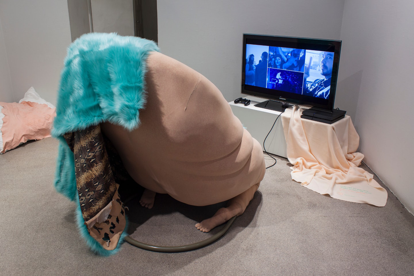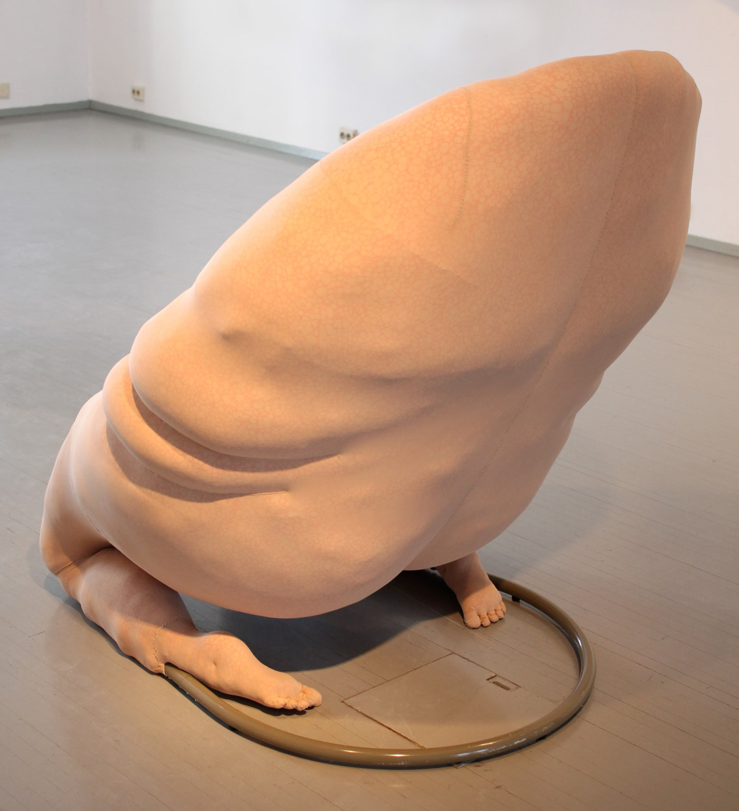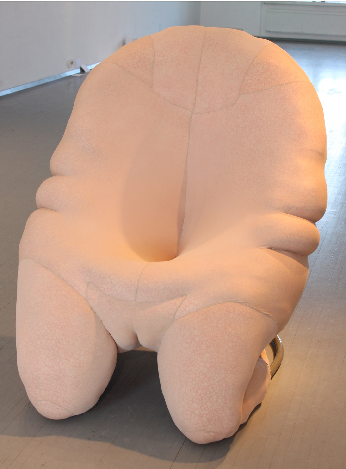 Fat Lap is a soft sculpture and armchair made by artist Reija Meriläinen in 2011. It is a semi-anthropomorphous shape that brings to mind an oversized baby bouncer. Recently, the piece was incorporated as a seat for a video installation in a new series of works titled Faint that Meriläinen made for the Turku Biennial. Meriläinen has a background in sewing and crafts, but has also worked extensively with digital media. The Faint exhibition combined textile work and embroidery with video game worlds and Linkin Park.