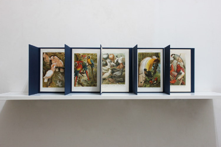 Anna Talens work Cinco jaulas are 5 object-books showing 5 types of birds caged among the embroidery threads, almost invisible, of silk. The work starts from the plates found in an antique shop with bird illustrations. A new book has been built for each of them. The spectator, attracted by the beauty of the illustrations, does not at first glance perceive that these birds are caged. It's about those situations where we build our own cages. About those absent moments of freedom.