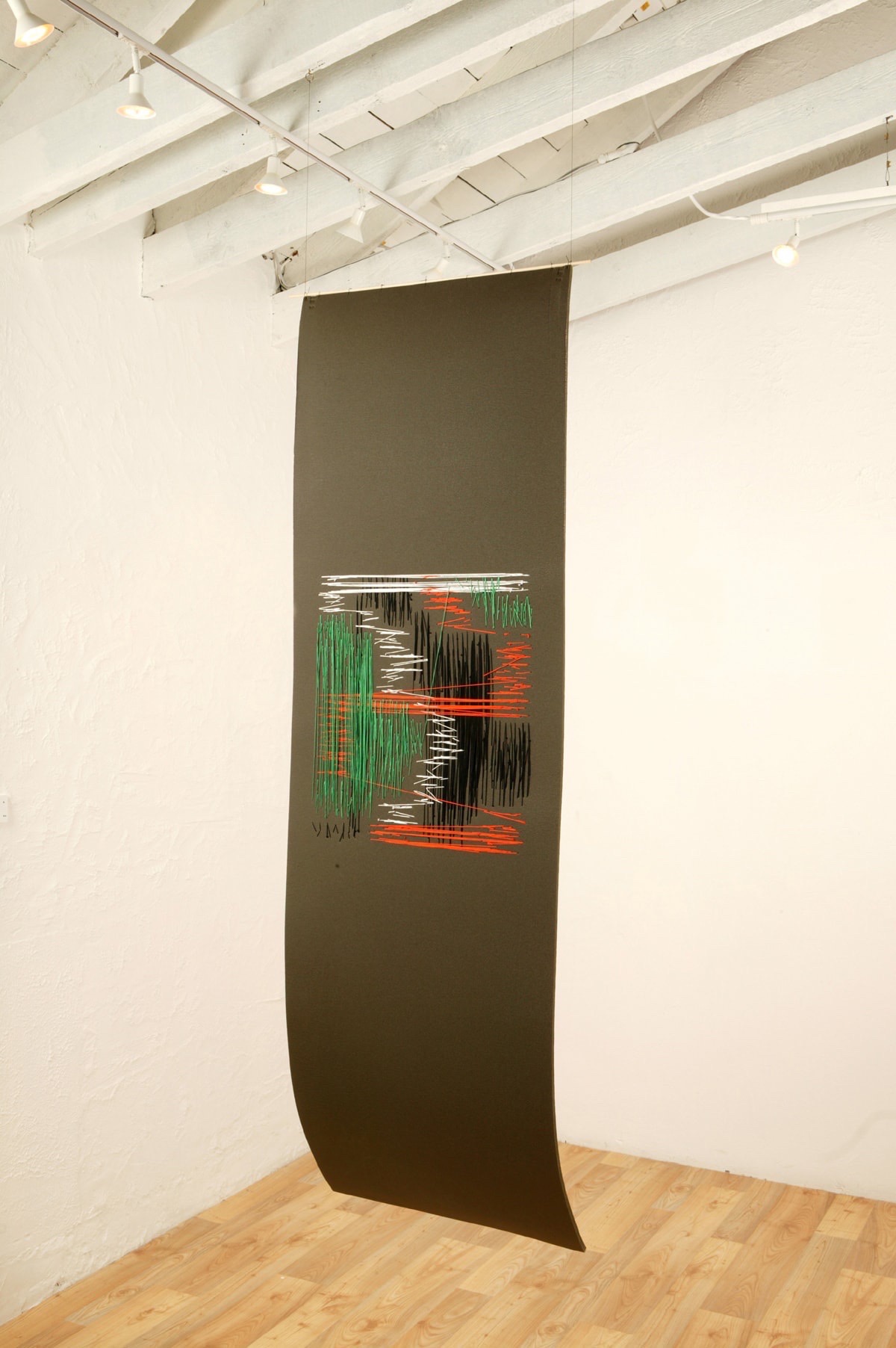 Collins often incorporates patterns from traffic and emergency signage into her work, referring to Op art while also waking up the eye, and giving the environment a visceral “stay alert” quality. Duality is at the core of my aesthetic (pain/pleasure, light/ dark, open/closed, and tension/release), and the work also explores liquid material, electric currents, interconnectivity, energy exchange, and explosive phenomena, both natural and human-made. Liz Collins work primarily with fabric, yarn, and other materials and techniques in the textile realm including jacquard knitting and weaving.