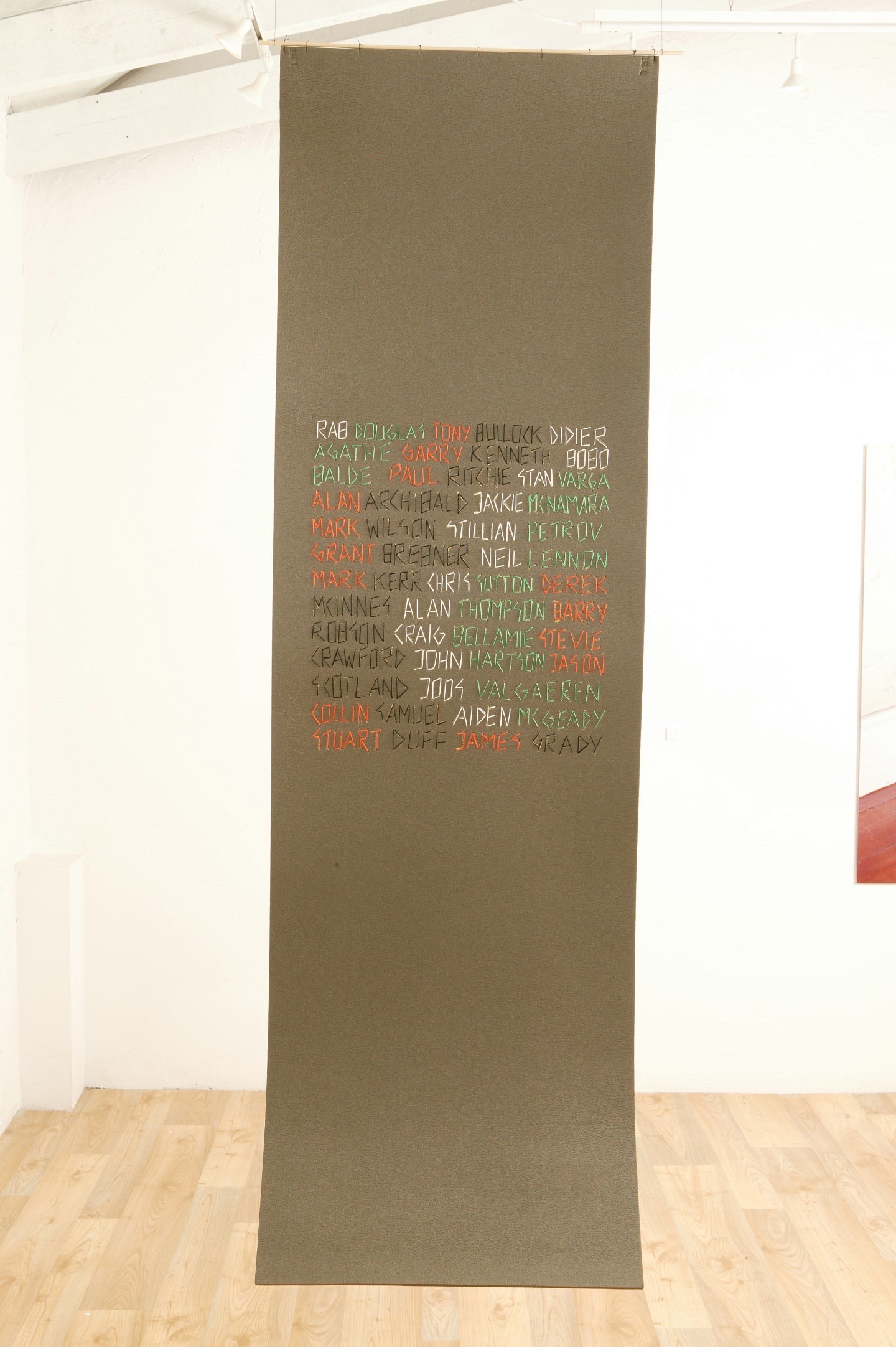 Jochen Flinzer handles needle and thread in an unconventional way by creating images that can always be viewed from two sides. A pre-defined A-side is equivalent to an abstract B-side. In The Big Cup Final, Flinzer refers to the Scottish Cup Final in which the Celtic Glasgow and Dundee United teams contested. Celtic Glasgow won and became the cup winner. The names of the players in this match are embroidered in the clubs’ colours on a camping mat: green/white for Celtic Glasgow and orange/black for Dundee United. They are listed club-alternating in the order of formation. On the back, the threads are alternately guided horizontally and vertically: Green vertically, white horizontally, orange vertically, and black horizontally. This work is a game of codes. Just as the colours stand symbolically for the clubs and can be immediately assigned by every fan, the back is based on the structure of the tartans, or tartan patterns, which mark the different Scottish clans.