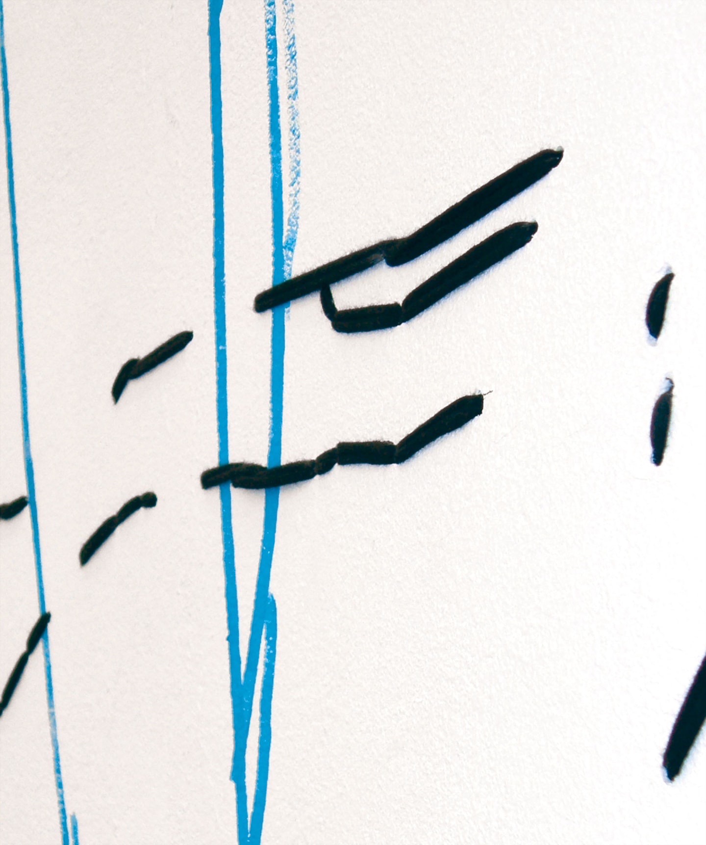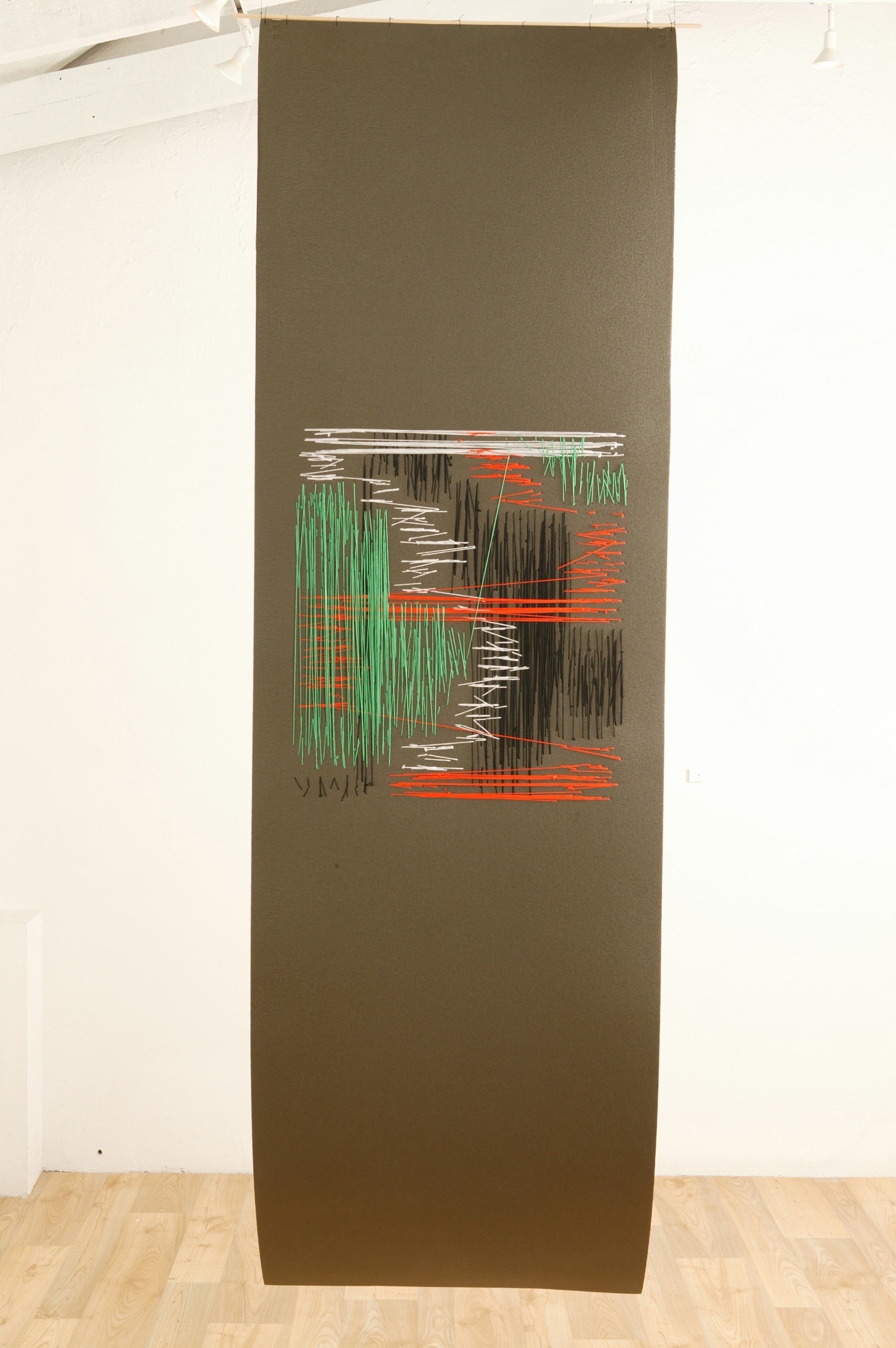 For almost a decade, Niedziolka has used embroidery thread on stretched canvas as her primary material – the resulting artworks rest somewhere between drawing, painting and tapestry. While past series employed multi-colored, simplified still life imagery as an archetype, a mostly monochromatic hatching effect is the focus of her latest artworks that are grouped under the name Zero