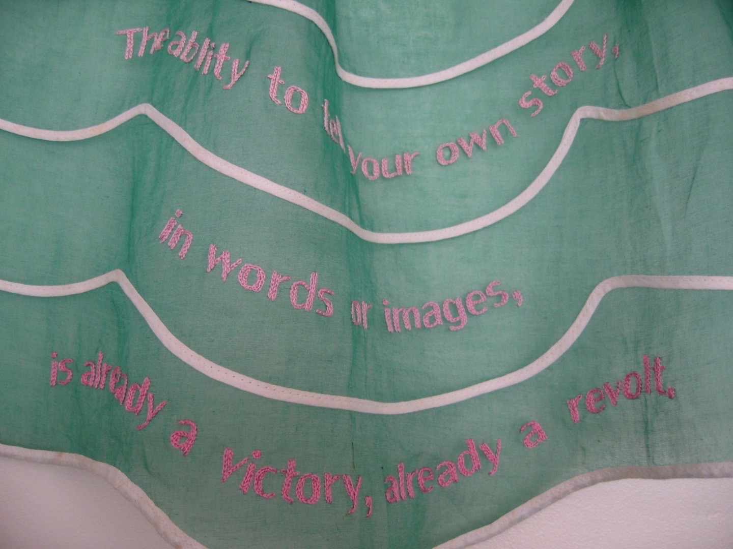 Barb Hunt lives in Newfoundland, Canada. The rich tradition of domestic textile practices inspired hepIXU pIXU pIXU ,IXU ؓIXU IXU @ IXU docile appearance of the apron and the power of telling one's truth. Embroidery can infer feminine obedience but the needle can also be wielded to prick the establishment. As a feminist artist, Hunt uses textile processes in solidarity with women of the past and present who devoted their labor to make the world a better place. Thus, Hunt politically loads the aprons and creates a different meaning of the object.