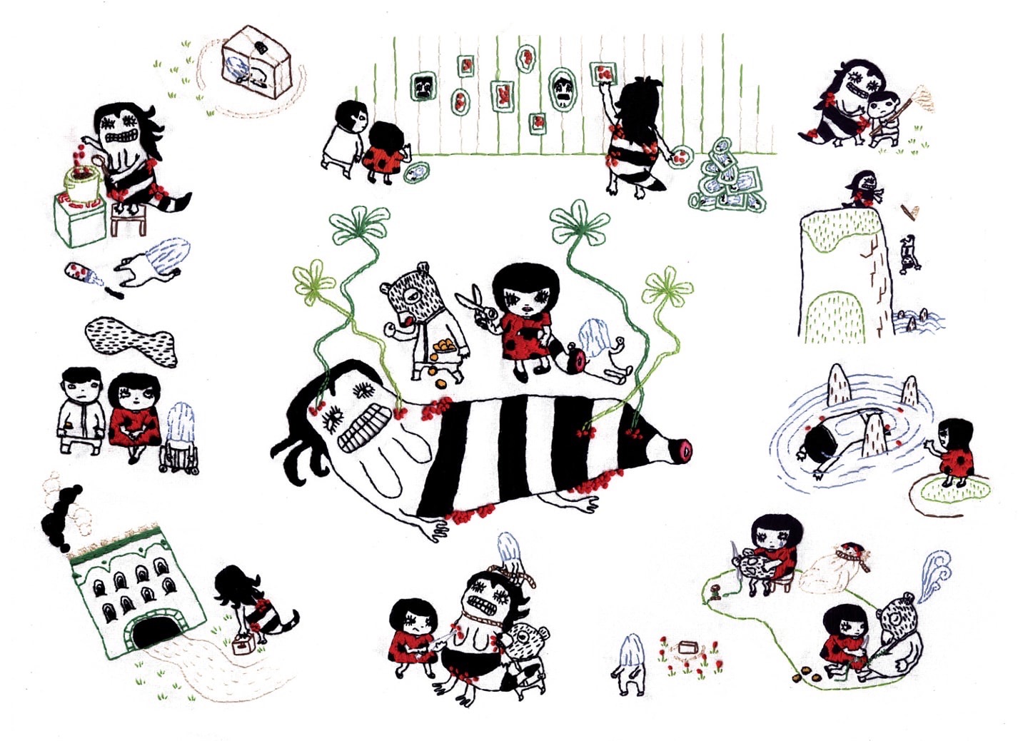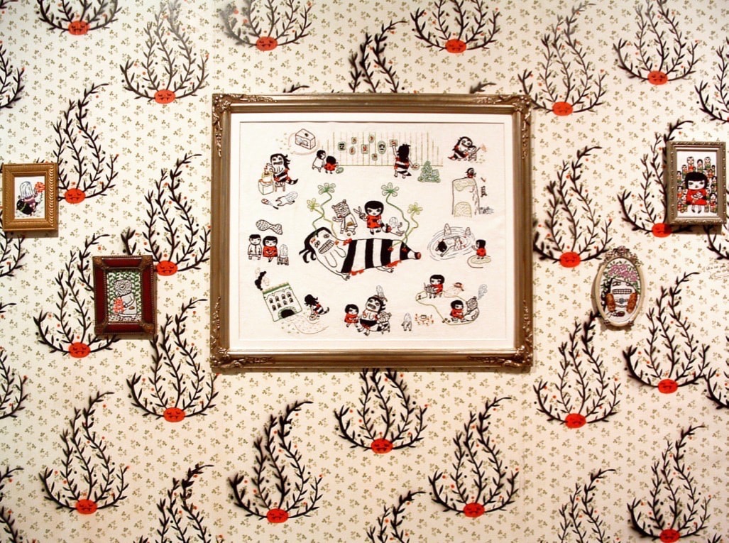 Aya Kakeda created a series of embroidery artwork for an exhibition themed "Cute & Scary" at Flux Factory in New York. Kakeda created a cozy space which appeared to be an elder woman's living room with divers embroideries. However, it is apparently a place fitting for a grandmother. If you take a closer look at the embroidery work, a grim and disturbing story appears. The story is about an evil nanny, who kills three children one by one and takes over their home. In the end, the children come back to life to get revenge on her. The alleged loving appearance of the embroidery artworks contrasts the story told and thereby takes on another meaning.
