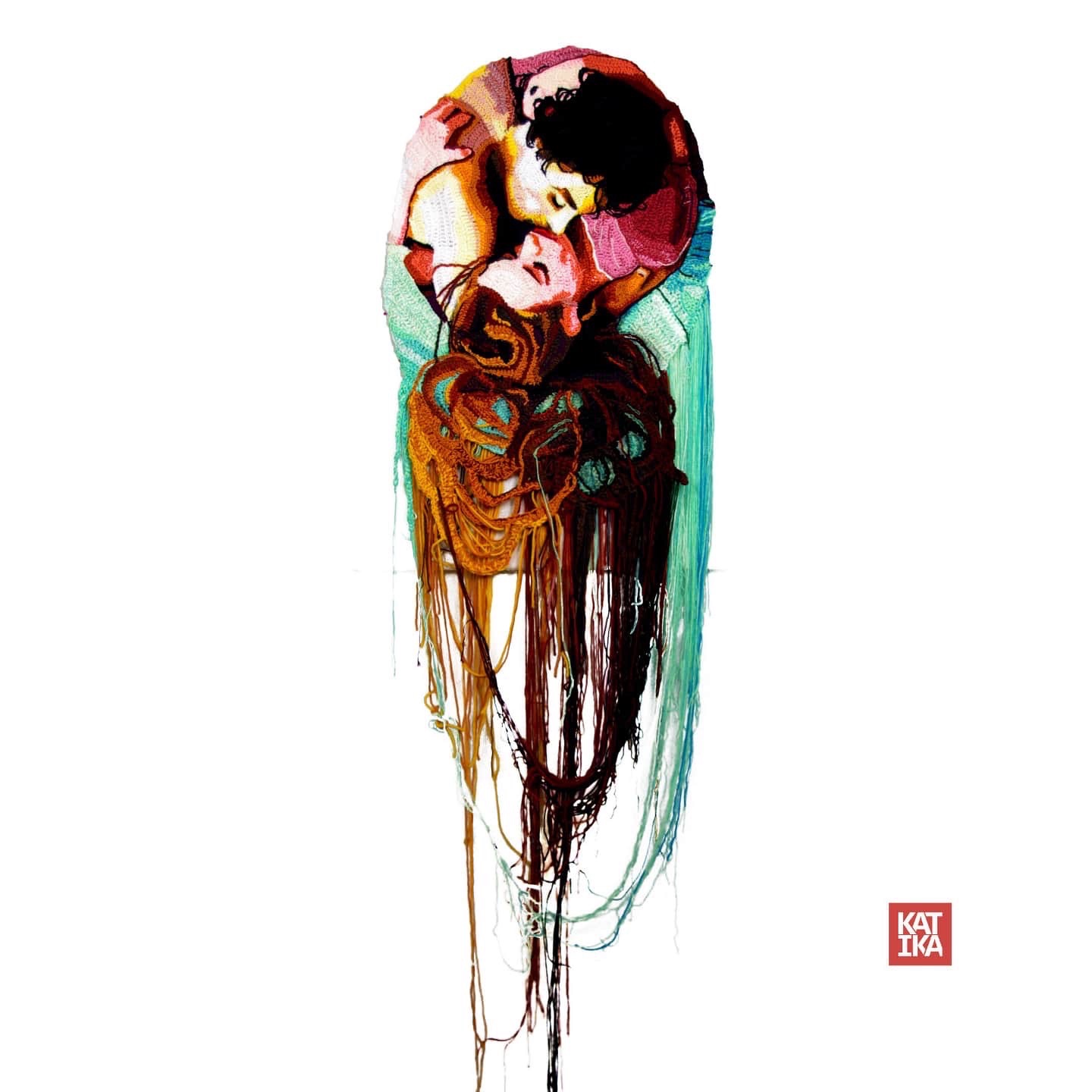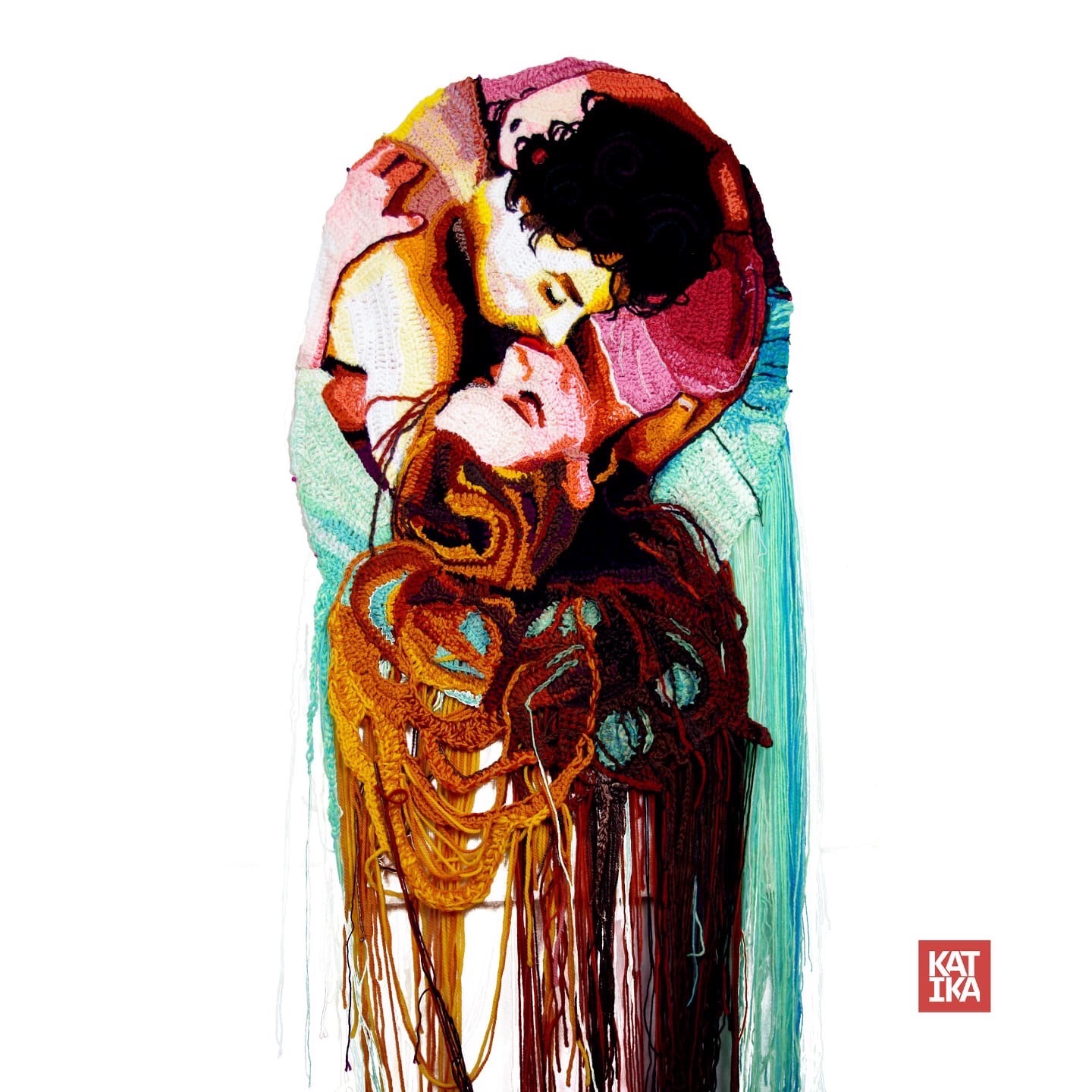 Katika’s Kiss is the latest installment of the series of yarn paintings called Attachment. In this series, Katika creates crocheted images of people in love to catch moments of happiness of couples all around the world. The threads not only represent the connections between people, but it also makes them infinite in the form of warm, bright, and joyful art. In addition, Katika prefers yarn as a material because it is uncompromising in its color which cannot be blended and the threads themselves cannot be hidden. Consequently, embroidery art is an honest technique for the artist.