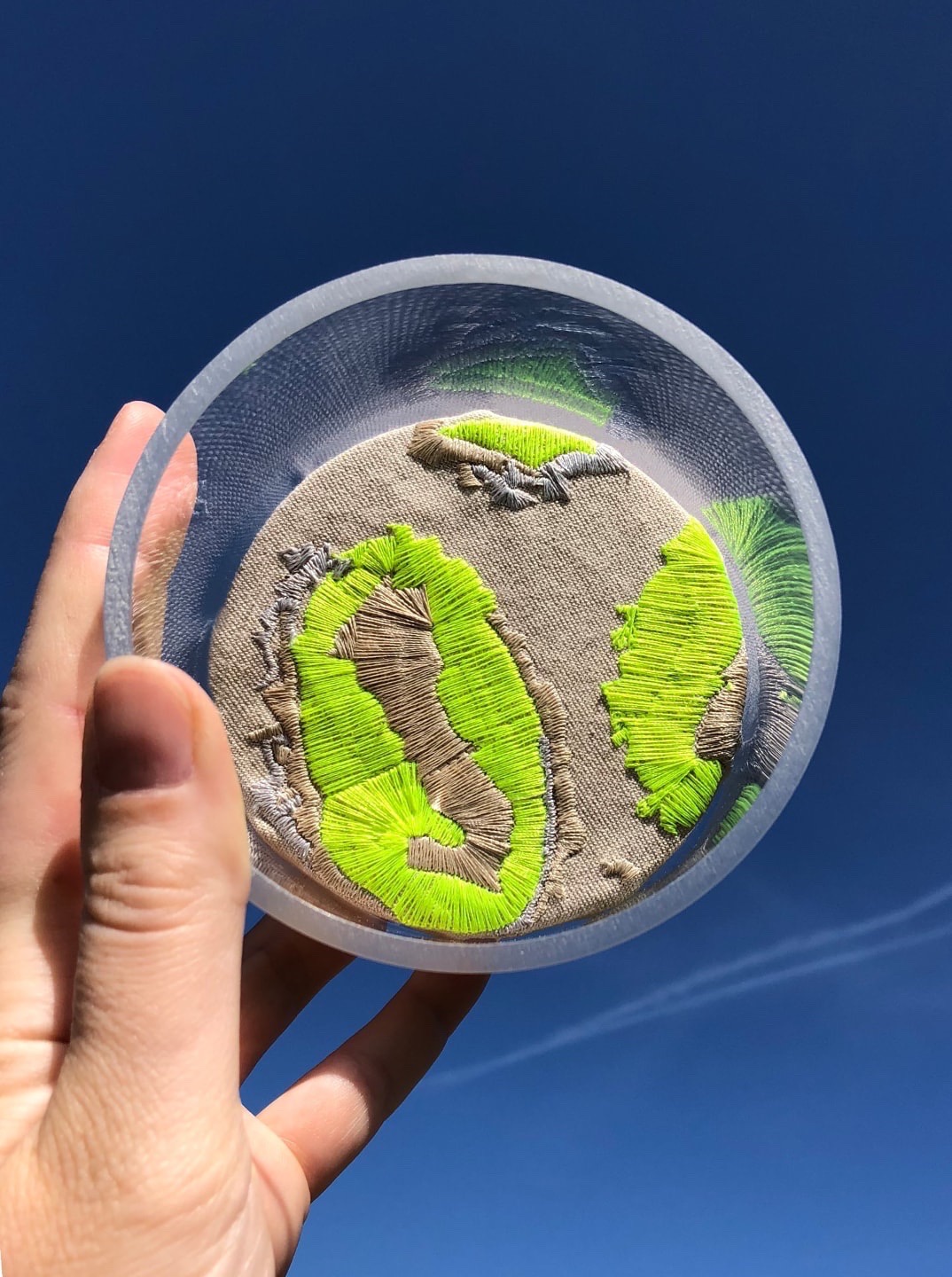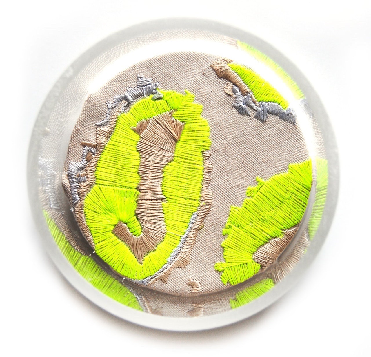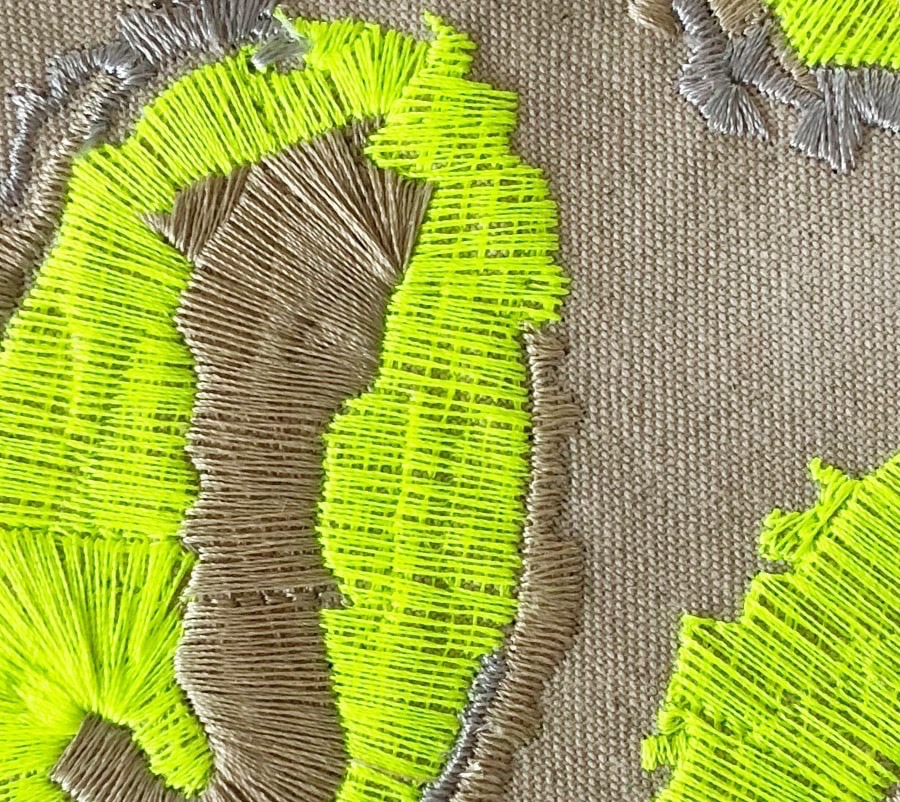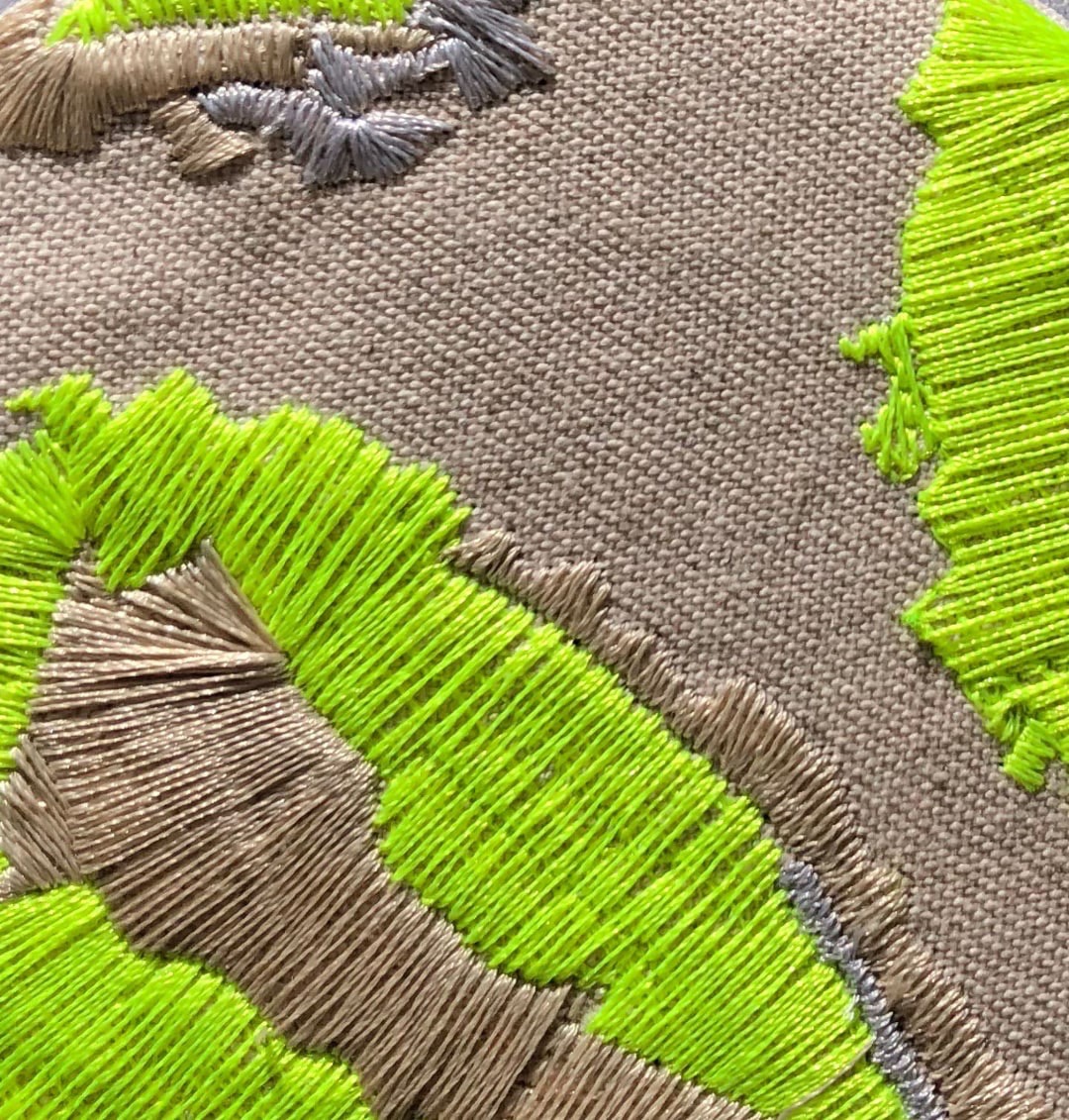 Wilkinson´s atlases show what remains after a glacier has carved its way through the landscape, leaving the ground both pockmarked and mountainous. The landscapes were inspired by the maps of Lewis and Clark, and she used hand-embroidery to emulate the distinct look of hand-drawn topographical markings. The artist is interested in utilizing the oldest mapping equipment around - our brains - to make these places come alive. When she´s working on these pieces, every group of stitches represents an elevation or depression, and she enjoys to daydreaming of the contours and deciding how steep the hills and valleys should be, and whether there will be subtle erosion or drastic alterations to the land. There is another reality that comes to being with each group of swooping stitches, the story of the landscape becoming clearer with every pass of the needle through the surface.