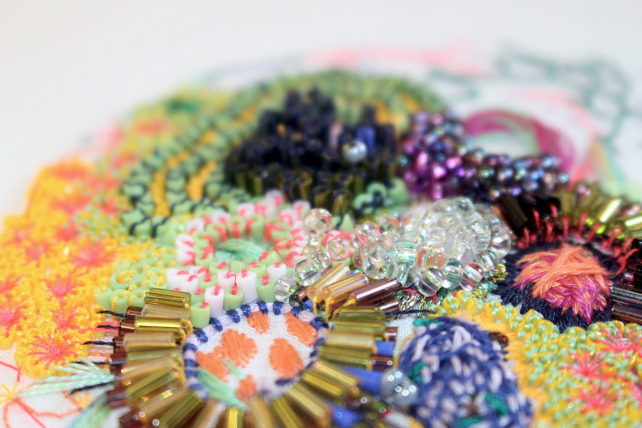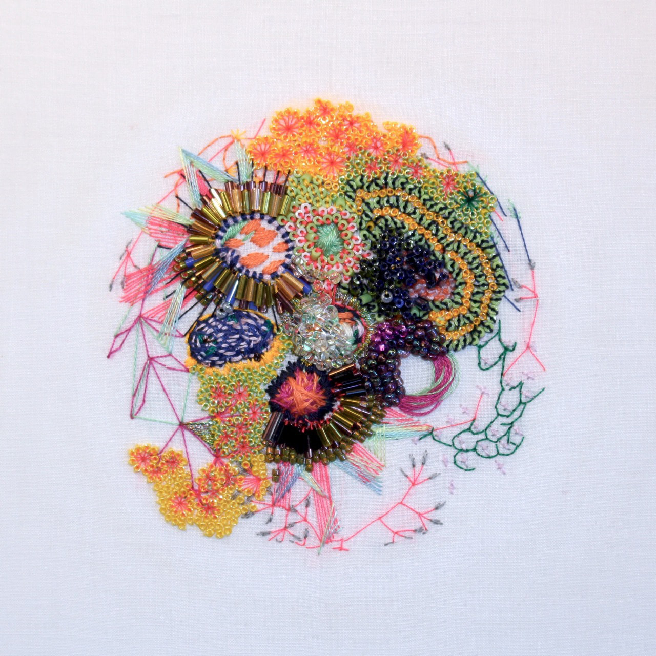 Karolin Reichardt practise focuses on an intuitive approach of traditional embroidery techniques. During her work process she likes to play with the precariousness of change and chance. With a specific interest in molecular structures "Microorganisms", an embroidery series using layered thread and beads on vintage handkerchiefs, comment on the romance and reality of scientific discovery.