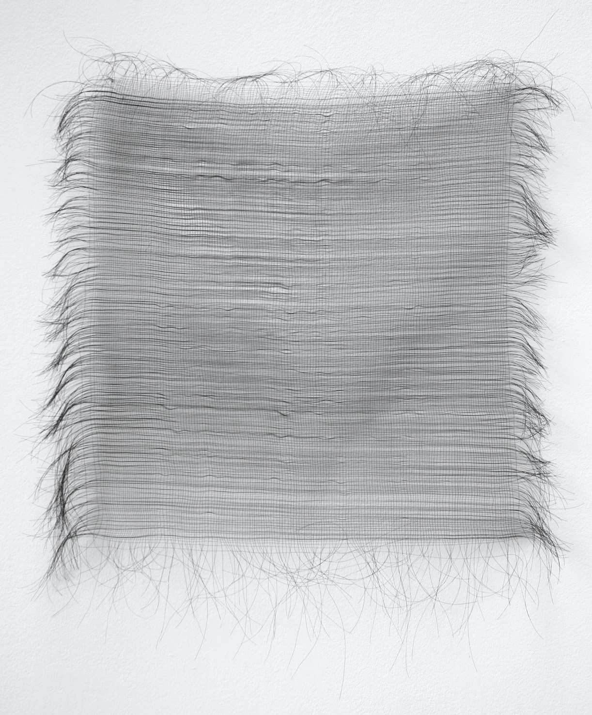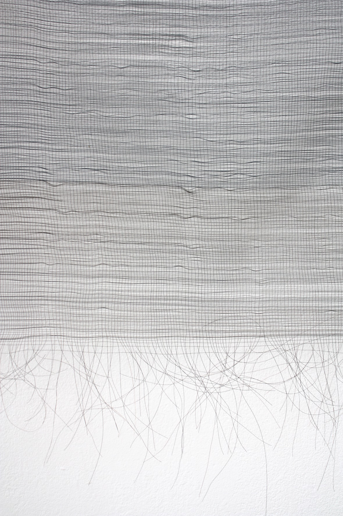 In the work No title the lines consist of hairs that are interwoven horizontally and vertically. Scharp interrupts the basic principle that connects with the grid, its uniformity and structure by taking advantage of the natural conditions of the hair, which expands differently according to the dryness and humidity of the surroundings.