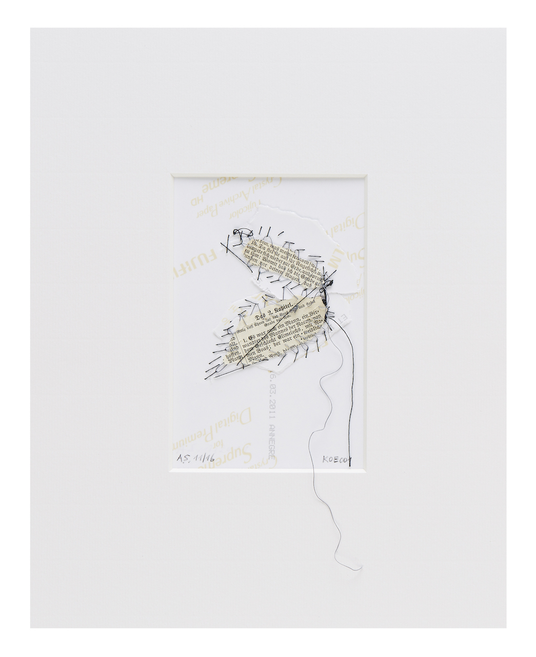 The base materials of Baumgartner’s works are found in anonymous photographs which she puts into a new context. She filters out a certain state of feeling and a new context in terms of content and/or form by processing the starting material through interventions such as sewing thread. The thread functions as a tool of extension and deconstruction that creates absurd, disturbing moments and moods. The starting material thereby not only gets a haptic level but also changes the meaning of the photographs and what they once shown. This way, Baumgartner appropriates the photographs and creates her own work.