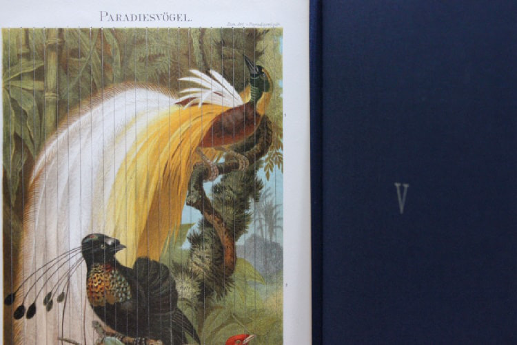 Anna Talens work Cinco jaulas are 5 object-books showing 5 types of birds caged among the embroidery threads, almost invisible, of silk. The work starts from the plates found in an antique shop with bird illustrations. A new book has been built for each of them. The spectator, attracted by the beauty of the illustrations, does not at first glance perceive that these birds are caged. It's about those situations where we build our own cages. About those absent moments of freedom.